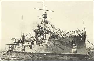 В 5 часов 35 минут утра через 20 минут после побудки в носовой части корабля вблизи фок-мачты раздался глухой взрыв. За ним тут же последовало еще три более сильных взрыва. Приблизительно в это же время (по одним показаниям одновременно со взрывами, по другим - раньше и позже) из левого носового каземата фор-марса и боевой рубки вырвалось пламя и оранжевый дым. Через несколько секунд после этого пламя и дым такого же цвета вырвались из правого каземата 194-миллиметрового орудия и носовой дымовой трубы.