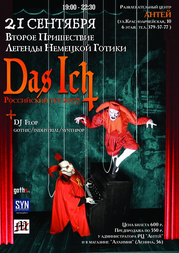 Каждый концерт Das Ich - это театрально-музыкально шоу. В котором Штефан держит публику в напряжении от первой и до последней ноты, а Бруно сплетает паутину музыки, кусочек которой унесёт с собой каждый слушатель. В прошлом году они уже приезжали в Россию и обещали вернуться, в этом году - они исполняют своё обещание.