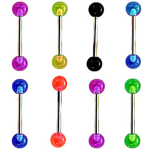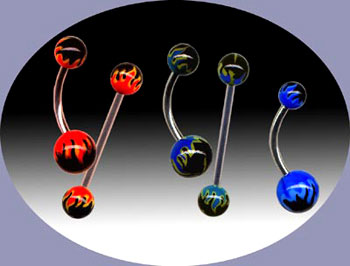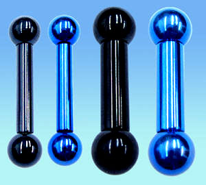 Навелы (бананы) - По форме напоминает штангу с изогнутым стержнем. Большой шарик припаян к стержню, а маленький отвинчивается. Также могут быть с камнями, значками и другими украшениями. В навелах используется хирургическая сталь 316L пробы, анодированный титан, а также эластичный акрил. Большой выбор цветов, размеров и материалов данного украшения дарит возможность быть неповторимыми.