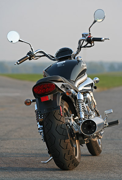 Первое, что бросается в глаза, прежде чем сядешь в седло и заведешь мотоцикл Hyosung GV 650 Aquila - его внешний вид. Безупречные, обтекаемые, плавные линии; машина похожа на каплю воды, которая формируется за счет земного притяжения. Мгновенно в голову приходят мысли о V-Rod, но большое количество сверкающих хромированных частей также заставляет вспомнить и о модели Yamaha Warrior. Внешний вид одновременно потрясающий, современный и классический, и, несмотря на то, что прослеживается влияние других марок, этот мотоцикл гораздо оригинальнее, чем бесчисленное количество клонов марки Harley, которые то и дело встречаются на дорогах по воскресеньям. После нажатия на стартер байк GV 650 оживает, а когда отрегулировано обогащение, двигатель начинает звучать очень многообещающе.