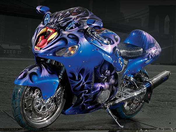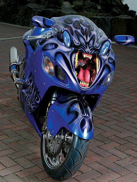 Откройте рот и скажите «А»! Базовые компоненты устрашающего облика машины Hayabeasta сняты с бутафорской головы саблезубого тигра, которую Денис Вазкез купил в местном театральном магазине. Вазкез вырезал челюсть, зубы и язык, а затем вставил их на место оригинальной фары мотоцикла. Фары дальнего света встроены в глаза, что завершает мощный визуальный эффект.