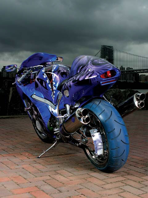 Установлены два глушителя от Blue Flame. Вазкез утопил штатные стоп-сигналы модели Hayabusa в хвост и подчистил заднюю часть, поставив хаггер от ART. Установленную на задний маятник скобу номерной таблички делает мастерская Pit Stop.Кастомизированный обтекатель покрыт не менее впечатляющей графикой, созданной фирмой Neso Graphics, которая сотрудничает с Pit Stop. Выполненная в пурпурных, серебристых и черных цветах, нанесенных на базовый синий металлик, графика в стиле скайфай/андерворлд подчеркивает зверский характер мускулистыми, жилистыми рисунками, которые временами перетекают в плавные линии женского тела.