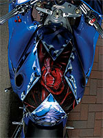Безупречная графика подчеркнута множеством частей из полированного алюминия (которые делают в мастерской Pit Stop) и первоклассного хрома (который поставляют Globe Plating из Ньюарка, штат Нью-Джерси). Под всем этим великолепием Вазкез был относительно сдержан. Два установленных двойных глушителя от Blue Flame - единственная модификация оригинального четырехцилиндрового мотора объемом 1300 куб. см. Среди других внешних модификаций комплект кованых колес Performance Machine's Gatlin с тормозными дисками от Braking Wave и покрышками марки Tomahawk. После сборки сзади и на раму привинтили слайдеры Pro-Tek, штатные ручки управления покрыли хромом и установили комплект ручек руля от занимающейся созданием чопперов фирмы Thunder Cycle Design, которой владеет Эдди Трота (Eddie Trotta). Ручки позволили не только подчеркнуть необычность мотоцикла, но и улучшить чувство машины при управлении. Заднюю часть сделали чище за счет установки крепления (которое делает Pit Stop) номерной таблички на задний маятник; плюс установили новый хаггер от ART.