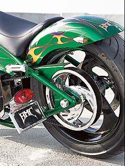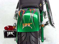 Помог один из друзей Майка, который быстро понял, какое крыло требовалось. Он привез крыло West Coast Choppers, и его форма в точности совпала с образом байка в голове Майка. Все подобранные компоненты были отправлены в Suspence Kustom Paint, где их покрасили той же краской, которая была использована для рамы. Чтобы подчеркнуть цвет и усилить впечатление, на зеленой основе было нарисовано несколько традиционных языков пламени пурпурного и оранжевого цвета.