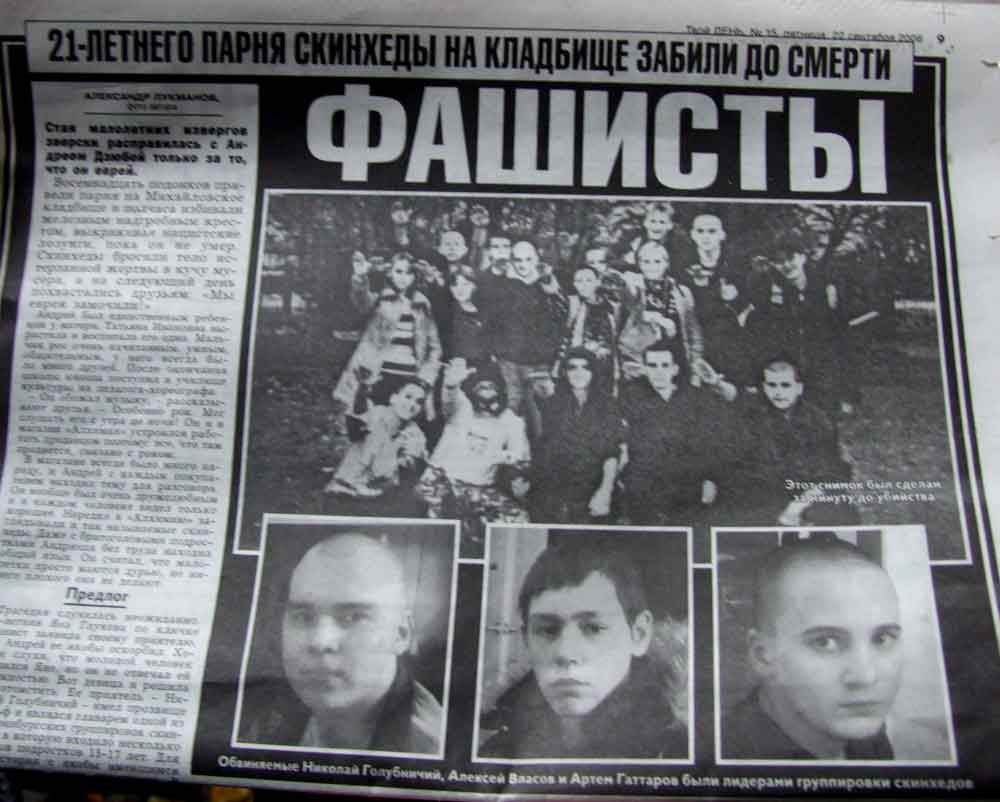 Восемнадцать подонков привели парня на Михайловское кладбище и полчаса избивали железным надгробным крестом, выкрикивая нацистские лозунги, пока он не умер. Скинхеды бросили тело истерзанной жертвы в кучу мусора, а на следующий день похвастались друзьям: «Мы еврея замочили!».